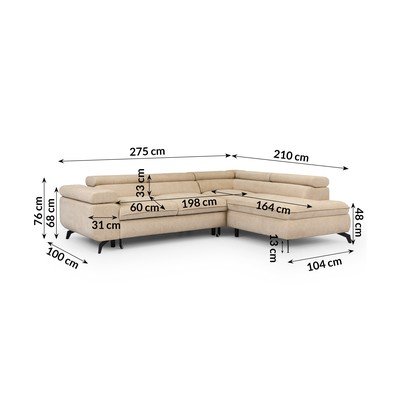 Iš šenilinio audinioReguliuojama/sulankstoma/su sandėliavimo vietaSu dešiniuoju kampu/„L“ formosTinka augintiniams/atsparus dėmėmsSmėlio spalvosKeturvietėPlotis 275 cmGylis 210 cmSėdynės gylis 60 cm