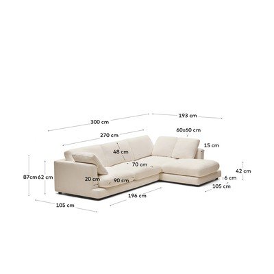 Iš šenilinio audinioSu dešiniuoju kampu/su gultuAtsparus dėmėmsSmėlio spalvosKeturvietėPlotis 300 cmGylis 193 cmSėdynės gylis 70 cm