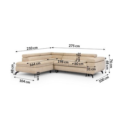 Iš šenilinio audinioReguliuojama/sulankstoma/su sandėliavimo vietaSu kairiuoju kampu/„L“ formosTinka augintiniams/atsparus dėmėmsSmėlio spalvosKeturvietėPlotis 275 cmGylis 210 cmSėdynės gylis 60 cm