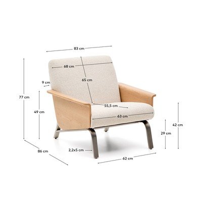 Kave Home Amsen krėslas pasipuošęs elegantišku ir nesenstančiu dizainu, tapsiančiu bet kurios erdvės akcentu. Jo šenilinis apmušalas su subtilia struktūra pagamintas iš 100 % perdirbto poliesterio, pasižyminčio vandenį atstumiančiomis savybėmis. Ši medžiaga tiekiama iš „Global Recycled Standard“ sertifikuoto tiekėjo ir taip pat turi „OEKO-TEX® STANDARD 100“ sertifikatą, užtikrinantį tvarią ir atsakingą gamybą.