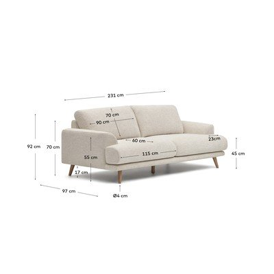 Iš šenilinio audinio, smėlio spalvos, trivietė, plotis 228 cm, gylis 97 cm, sėdynės gylis 60 cm
