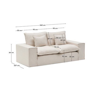 Iš linoSu nuimamu užvalkaluSmėlio spalvosTrivietėPlotis 240 cmGylis 107 cmSėdynės gylis 76 cm