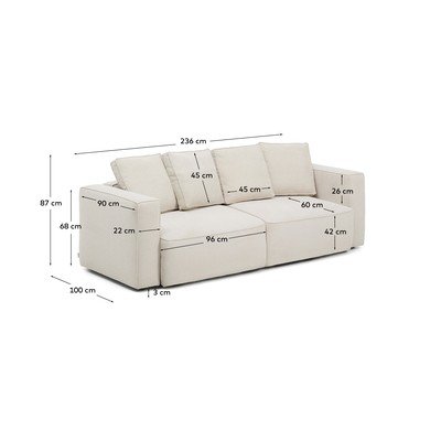 Sofa MarelaIš šenilinio audinio, sulankstoma, atsparus dėmėms, smėlio spalvos, trivietė, plotis 236 cm