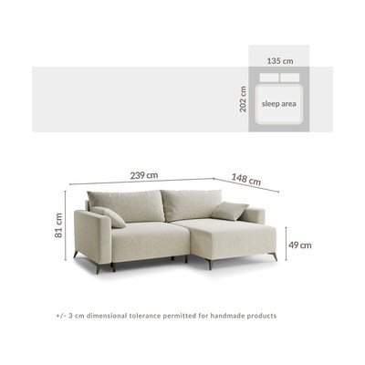 Iš šenilinio audinioSulankstoma/su sandėliavimo vietaSu dešiniuoju kampu/su gultuSmėlio spalvosTrivietėPlotis 239 cmGylis 148 cmSėdynės gylis 65 cm