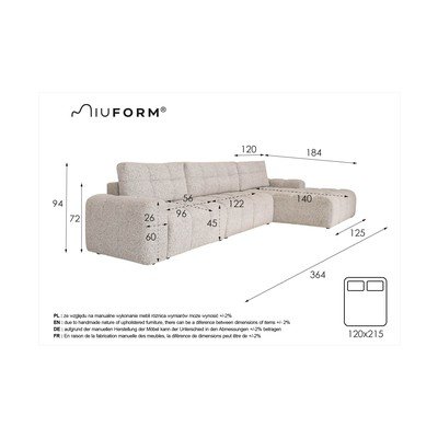 Sulankstoma/su sandėliavimo vietaSu dešiniuoju kampuSmėlio spalvosKito dydžioPlotis 364 cmGylis 184 cmSėdynės gylis 56 cm