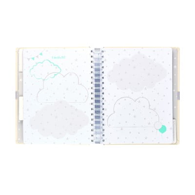 Kūdikio dienoraštis nuo nėštumo iki pirmųjų gyvenimo metų. Grafinis vaizdas, daug vietos prisiminimams ir nuotraukoms.