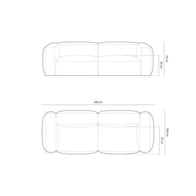 Iš šenilinio audinioSmėlio spalvosTrivietėPlotis 240 cmGylis 106 cmSėdynės gylis 75 cm
