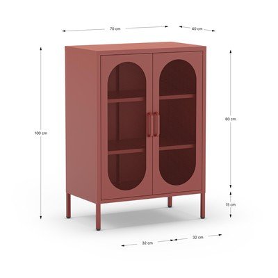 Iš metalo, paviršiaus apdaila: miltelinis dažymas, raudonos plytų spalvos, plotis 70 cm, aukštis 100 cm, gylis 40 cm