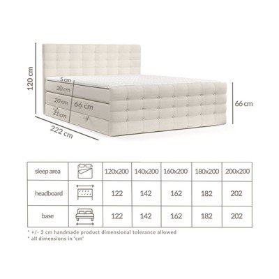 20 cm aukščio apatinį čiužinį sudaro bonelinės spyruoklės ir putų poliuretanas. Viršutinis čiužinys turi septynias kietumo zonas - galvos, pečių, juosmens, dubens, šlaunų, blauzdų ir pėdų.
