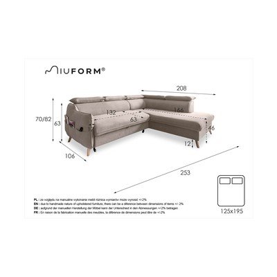 Iš velvetoReguliuojama/sulankstomaSu dešiniuoju kampu/„L“ formosAtsparus vandeniui/tinka augintiniamsŠviesiai pilkos spalvosKeturvietėPlotis 253 cmGylis 208 cmSėdynės gylis 63 cm