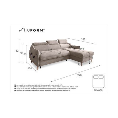 Reguliuojama/sulankstoma/su sandėliavimo vietaSu dešiniuoju kampu/su gultuŠviesiai pilkos spalvosTrivietėPlotis 228 cmGylis 162 cmSėdynės gylis 63 cm