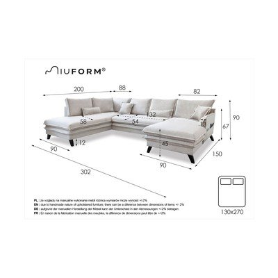 Sulankstoma/su sandėliavimo vietaSu kairiuoju kampu/„U“ formosŠviesiai mėlynos spalvosKito dydžioPlotis 302 cmGylis 200 cmSėdynės gylis 58 cm