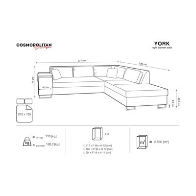Kampinė sofa YorkIš velveto, sulankstoma/su sandėliavimo vieta, su dešiniuoju kampu, atsparus vandeniui/tinka augintiniams, šviesiai pilkos spalvos, keturvietė, plotis 277 cm, gylis 96 cm, sėdynės gylis 66 cm