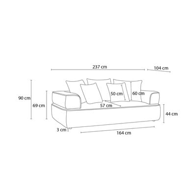 Iš šenilinio audinio, šviesiai pilkos spalvos, trivietė, plotis 237 cm, gylis 104 cm, sėdynės gylis 57 cm