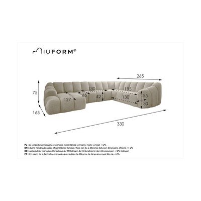Su dešiniuoju kampu/„U“ formosTinka augintiniamsŠviesiai pilkos spalvosKito dydžioPlotis 330 cmGylis 265 cmSėdynės gylis 65 cm