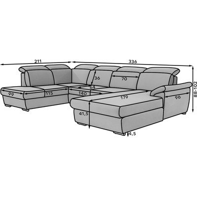 Reguliuojama/sulankstomaSu kairiuoju kampu/„U“ formosŠviesiai pilkos spalvosKito dydžioPlotis 336 cmGylis 211 cmSėdynės gylis 64 cm