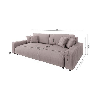Iš kordinio velveto, sulankstoma/su sandėliavimo vieta, šviesiai rožinės spalvos, trivietė, plotis 234 cm, gylis 122 cm, sėdynės gylis 80 cm