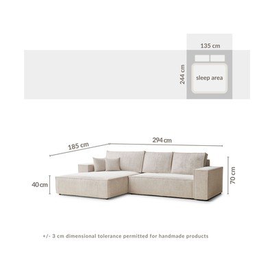 Iš šenilinio audinioSulankstoma/su sandėliavimo vietaSu kairiuoju kampu/su gultuŠviesiai rudos spalvosKeturvietėPlotis 294 cmGylis 185 cmSėdynės gylis 65 cm
