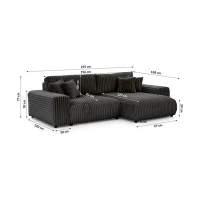 Iš kordinio velvetoSulankstoma/su sandėliavimo vietaSu dešiniuoju kampuAtsparus vandeniui/atsparus dėmėmsTamsiai pilkos spalvosTrivietėPlotis 255 cmGylis 168 cmSėdynės gylis 82 cm