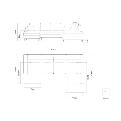 Iš velveto, sulankstoma/su sandėliavimo vieta, su dešiniuoju kampu/„U“ formos, tamsiai pilkos spalvos, kito dydžio, plotis 313 cm
