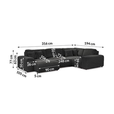 Iš kordinio velvetoSu dešiniuoju kampu/„U“ formosAtsparus vandeniui/atsparus dėmėmsTamsiai pilkos spalvosKeturvietėPlotis 316 cmGylis 194 cmSėdynės gylis 73 cm