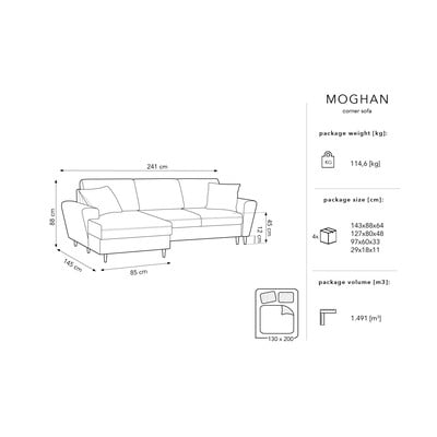 Su Moghan sofa namuose netrūks nei komforto, nei stiliaus. Micadoni Home prekės ženklo dėka jame taip pat rasite jiems būdingų skandinaviško stiliaus elementų. Paviršių sudaro matinės tekstūros audinys su siauromis 3 mm juostelėmis, labai atsparus trinčiai. Hidrofobinė danga neleidžia skysčiams prasiskverbti į sofos vidų. Be to, ji turi Oeko-Tex sertifikatą, kuris užtikrina sveikatos saugą be kenksmingų cheminių medžiagų ir sumažina gamybos proceso poveikį aplinkai.