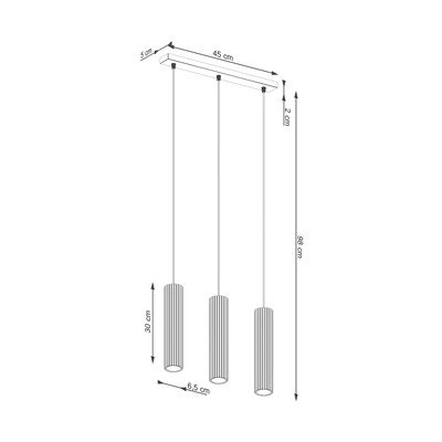 Pakabinamas šviestuvas Gleam iš Sollux. Trys atskiri rievėto paviršiaus šviestuvai elegantiškai apšviečia erdvę.