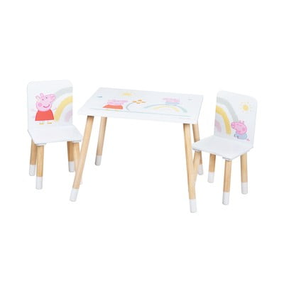Šį vaikiškų baldų komplektą sudaro stalas ir dvi kėdės, skirtos patogiai ir saugiai sėdėti. Dėl kompaktiško dydžio jis puikiai tinka vaiko kambariui ar žaidimų aikštelei. Kėdžių sėdimosios dalies aukštis 28 cm, o bendri matmenys 54 × 26,5 × 26,5 cm. Stalo matmenys - 49 × 60 × 50 cm.