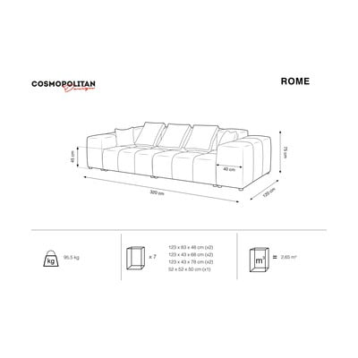 Atraskite funkcionalumo ir elegancijos derinį ir rinkitės iš daugybės sofos Rome spalvų variantų. Sofą sudaro keli moduliai, atlošai ir porankiai, kuriuos taip pat galite įsigyti atskirai, kad susikurtumėte savo kūrinį, tinkantį tiek jūsų poreikiams, tiek interjerui. Iš modulių galite susikurti mažesnę ar didesnę sofą, kampinę sofą ar net U formos sofą. Be to, Rome asortimente rasite įvairių dydžių ir spalvų pagalvėlių, kurios suteiks jūsų sofai jaukumo ir dar daugiau komforto. Taip pat galite išbandyti aksominę sofos Rome Velvet versiją.