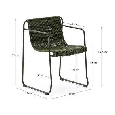 Kave Home sodo kėdė Maurina yra sukurta naudoti lauke. Ją galima sukrauti vieną ant kitos, taip sutaupant vietos.