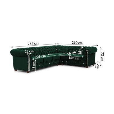 Iš velvetoSulankstomaChesterfield tipoSu dešiniuoju kampu/„L“ formosAtsparus vandeniui/atsparus dėmėmsŽalios spalvosKeturvietėPlotis 264 cmGylis 210 cmSėdynės gylis 58 cm