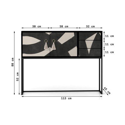 Iš MDF plokštėsPaviršiaus apdaila: lakuotas/paviršiaus apdaila: spausdintasJuodos spalvos/smėlio spalvosPlotis 113 cmAukštis 92 cmGylis 30 cm